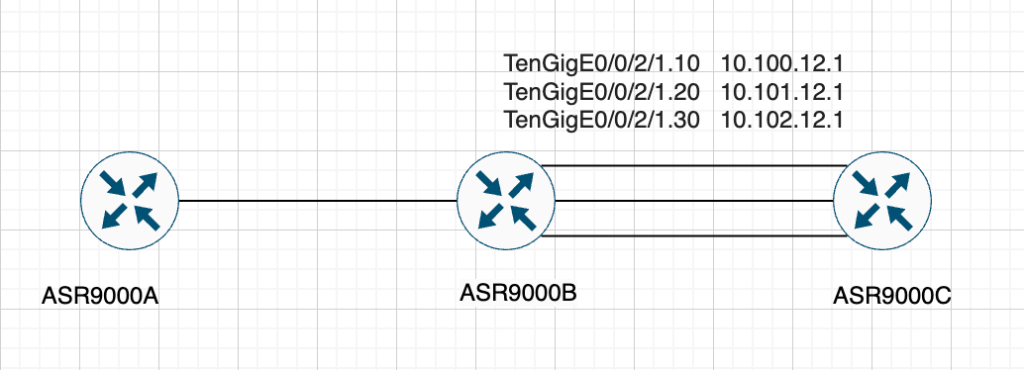 The topology shows as above , the DUT ASR9000B has 3 sub-interface to ASR9000C