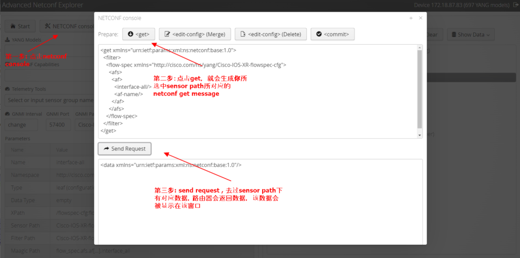 如何快速的 get 到该 sensor path 下的数据呢,我们需要使用 NETCONF console 的工具: