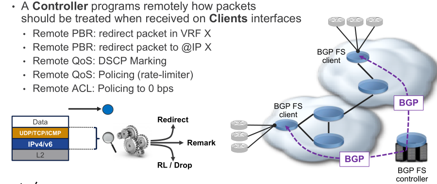 BGP Flow Specification 功能是一种用于防止 DoS(Denial of Service)/DDoS(Distributed Denial of Service)攻击的方法,可以提高网络安全性和可用性。其实现方式为 BGP FS controller 通过 BGP 下发特定的规则给 BGP FS client, BGP FS client 收到后按照该规则对特定流进行 redirect/remark/drop/rate limit。