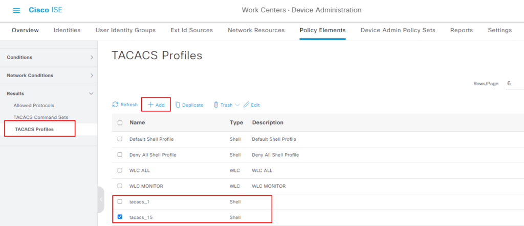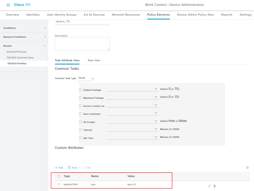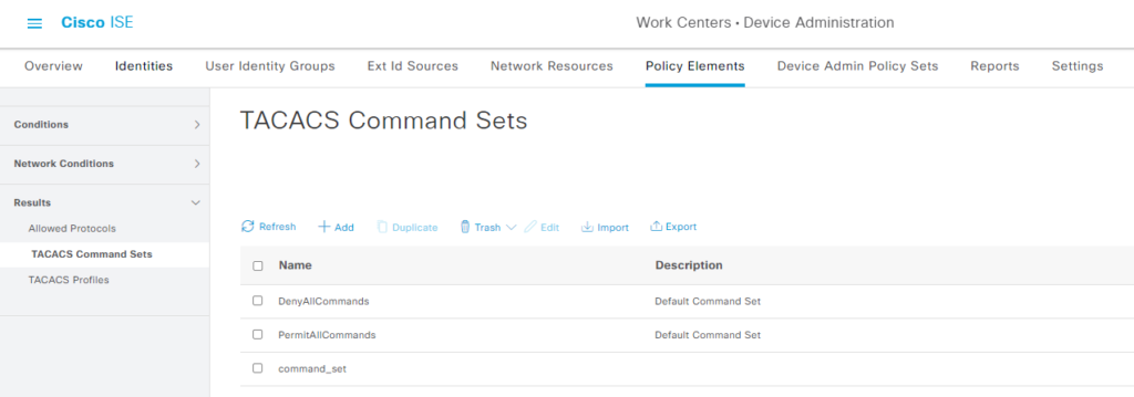 我们需要先去创建几个授权策略, 路径: Work Centers -> Device Administration ->Policy Elements -> Results - >Tacacs Command Sets /Tacacs Profiles