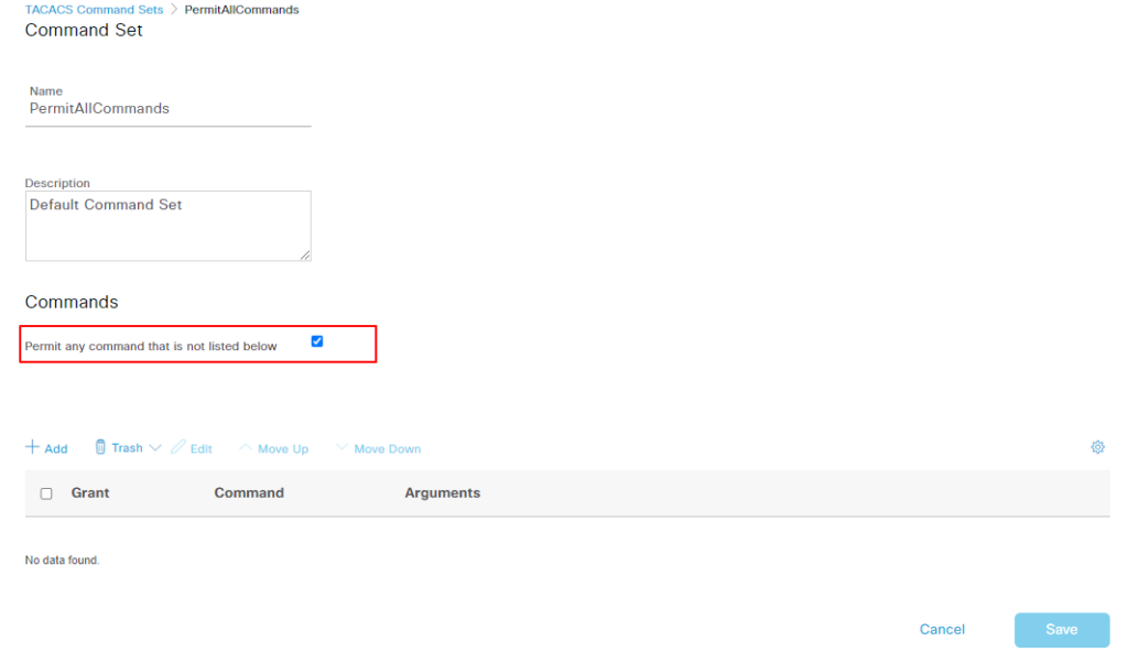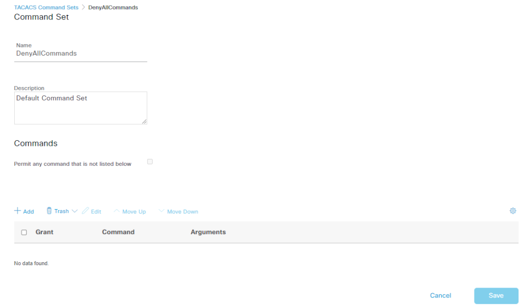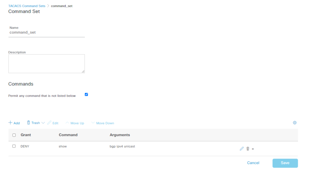 如下我们配置几个 command sets 测试, deny all/permit all/others