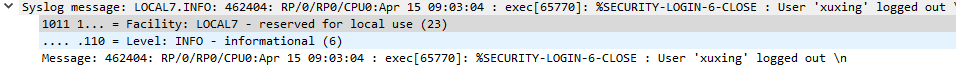 Facility 用来表示 log 信息的来源或者说是 log 信息的类别,默认 IOS XR 设备使用的是 LOCAL 7 , id 23。