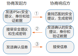 - 消息 ① 和 ② 用于提议交换发起方发送一个或多个 IKE 安全提议,响应方查找最先匹配的 IKE 安全提议,并将这个 IKE 安全提议回应给发起方。匹配的原则为协商双方具有相同的加密算法、认证算法、认证方法和 Diffie-Hellman 组标识。