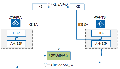 IKE 与 IPSec 的关系如下图所示,对等体之间建立一个 IKE SA 完成身份验证和密钥信息交换后,在 IKE SA 的保护下,根据配置的 AH/ESP 安全协议等参数协商出一对 IPSec SA。此后,对等体间的数据将在 IPSec 隧道中加密传输。