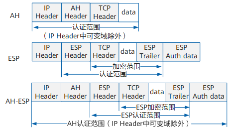 AH 仅支持认证功能,不支持加密功能。AH 在每一个数据包的标准 IP 报头后面添加一个 AH 报文头,AH 对数据包和认证密钥进行 Hash 计算,接收方收到带有计算结果的数据包后,执行同样的 Hash 计算并与原计算结果比较,传输过程中对数据的任何更改将使计算结果无效,这样就提供了数据来源认证和数据完整性校验。AH 协议的完整性验证范围为整个 IP 报文。 - ESP 协议