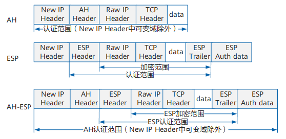 ESP 支持认证和加密功能。ESP 在每一个数据包的标准 IP 报头后面添加一个 ESP 报文头,并在数据包后面追加一个 ESP 尾(ESP Trailer 和 ESP Auth data)。与 AH 不同的是,ESP 将数据中的有效载荷进行加密后再封装到数据包中,以保证数据的机密性,但 ESP 没有对 IP 头的内容进行保护,除非 IP 头被封装在 ESP 内部(采用隧道模式)。