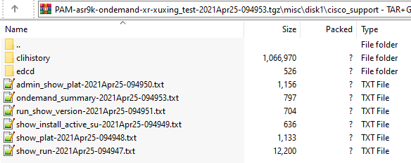 如上所示,系统会尝试一个 tar 文件"harddisk:/cisco_support/PAM-asr9k-ondemand-xr-xuxing_test-2021Apr25-094953.tgz", 从设备中 copy 出来解压缩显示如下: