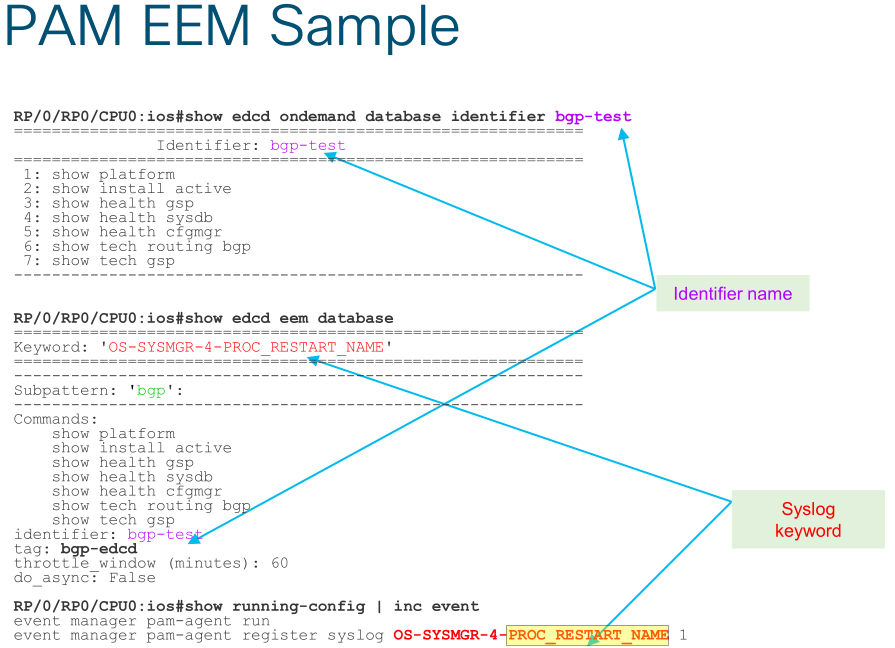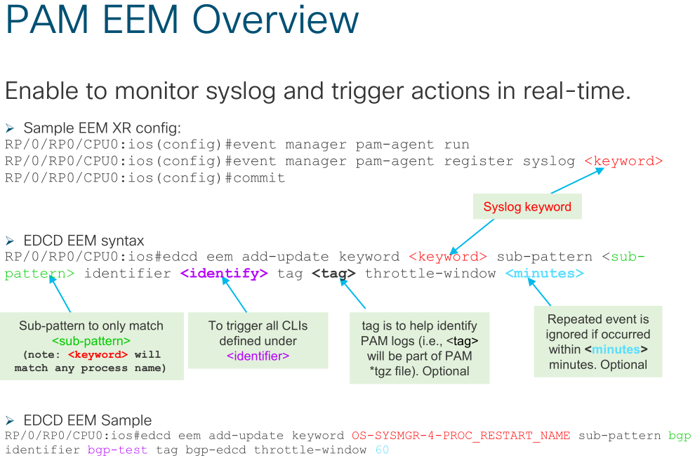 PAM(Platform Automated Monitoring),从 6.1.2 版本开始(64bit, not in 32bit)开始引入该功能, 并且默认情况下是自动启动,用于监视进程 crash,memory leak, CPU hog,traceback , disk usage 等, 具体点就是当检测到某一事件时, 会自动采集一些信息并默认保存到 harddisk:/cisco_support 目录下, 供我们 troubleshooting, 这一功能是全自动的,目前没法手动配置,具体示例可以参考以下文档:
