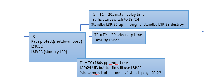 Jul 8 15:55:32.681 mpls_te/unique 0/0/CPU0 7# t1 T:1, Type:TE, started install timer:20 secs, 100 msec, [CURRENT] L:22, [REOPT] L:24